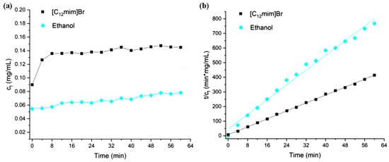 From Figure 10a, it can be seen that the ultrasound-assisted extraction of turmeric-like substances is very important. In the process of extracting turmeric substances using ionic liquids, with the increase in ultrasound time, the concentration of turmeric substances in the extraction solution initially increases rapidly and finally tends to flatten out. Without ultrasound assistance, the extraction efficiency of ionic liquids will significantly decrease. When the extraction time is 0, the concentration of turmeric substances dissolved in [C12mim] Br is higher than that in ethanol. The first stage is related to the type of ionic liquid but not to the length of the carbon chain. It may be due to the stronger hydrogen bonding effect of imidazolium ionic liquids compared to quaternary ammonium ionic liquids, which have a stronger ability to dissolve and destroy cellulose in the cell wall. The second stage is not only related to the type of ionic liquid but also to the carbon chain length of the ionic liquid as the mass transfer process is dominant in this stage. Increasing the carbon chain length of the ionic liquid leads to an increase in viscosity, and slowing down the mass transfer leads to a slower extraction rate. In the process of ethanol extraction, the concentration of turmeric substances shows a relatively gentle trend over time, and the final extraction effect is not as good as that of ionic liquids. Due to the poor penetration of ethanol compared to ionic liquids, the extraction ability of turmeric-like substances in turmeric powder is poor, and the extraction efficiency in the second stage is poor. Simulate the second stage of the extraction process using a second-order kinetic model of extraction. The simulated linear fitting results are shown in Figure 10b. Moreover, the extraction saturation concentration (CS), extraction rate constant (k), initial extraction rate (h), and correlation coefficient (R2) obtained through fitting calculation are shown in Table 3. It can be observed that the initial extraction rate and rate constant of ionic liquids are higher than those of ethanol. As comparison, the R2 of first-order kinetics was 0.89861, indicating the latter was not suitable for the fitting data here.
