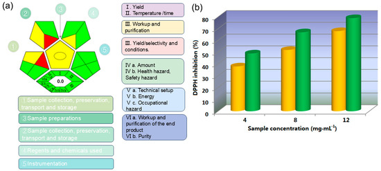(a) The greenness of extraction evaluated by ComplexGAPI and (b) antioxidant activities of different extracts (yellow: ethanol extract; green: IL extract).