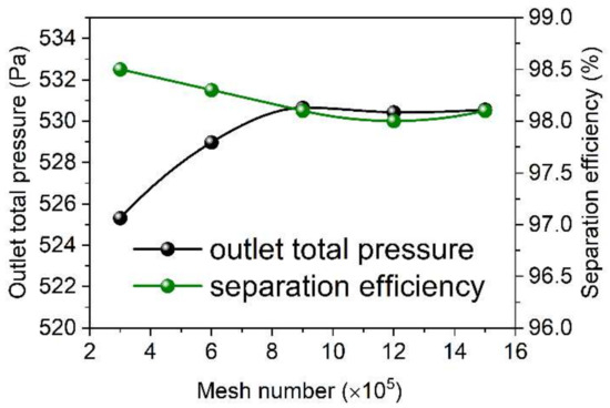The number of meshes a significant influence on the numerical simulation results. Therefore, mesh-independent analyses were carried out by increasing the mesh number from 3 × 105 to 9 × 105, with an increase of ~3 × 105 meshes for each time. Figure 3 shows the outlet pressure and separation efficiency of the cyclone obtained based on the numerical simulation carried out with various mesh numbers. As shown in Figure 3, the outlet pressure and separation efficiency change significantly with the increase in mesh number from 3 × 105 to 9 × 105, which indicates that the numerical simulation results are sensitive to the mesh number. However, the change in outlet pressure becomes less sensitive along with the increase in mesh number from 9 × 105 to 15 × 105, which is changed from 530.65 Pa to 530.55 Pa. Similarly, the separation efficiency shows a similar change phenomenon with that of the outlet pressure, which shows no change with the increase in mesh number from 9 × 105 to 15 × 105. These results indicate that a mesh number of 9 × 105 is sufficient for the simulation of cyclone separation, which is therefore adopted for subsequent numerical simulation of cyclone separation.