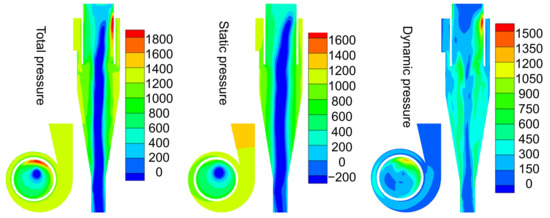 The distribution of total, static and dynamic pressure in the cyclone model.