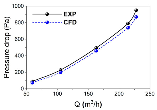 The inlet pressure (Pin,measure) is measured at a certain distance upstream of the screw feeder. Taking into account the local resistance loss (ΔPl) caused by the elbow piping between the measurement point and the prototype inlet, and the friction loss along the piping (ΔPf), the actual inlet pressure (Pin,EXP) of the cyclone is reduced from the measured value, which was calculated using the following Equation (7):