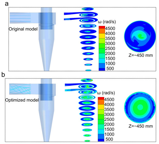 In order to enhance the rotation of particles, we carried out the CFD calculations by tuning the inlet flow pattern of the cyclone from linear flow to vortex flow. As shown in Figure 10, the rotation speed of particles based on the CFD calculations using the vortex flow inlet (the optimized model) shows evident enhancement as compared with those of CFD calculations using the linear flow inlet (the original model), which enlarges the area of the effective rotation zone by up to 400% (the plane at −450 mm in the Z-axis direction) and significantly increases the peak rotational speed close to 4500 rad/s. For the CFD calculations employing the vortex flow inlet, high-velocity rotation was found to be mainly located in the forced vortex flow and the attached surface layer in all planes. This phenomenon is explained by the fact that when the fluid approaches the solid interface, the tangential velocity tends to decrease to zero, while the tangential velocity gradient increases steeply. These results reveal that the rotation-based separation capability of the cyclone can be significantly enhanced by using the vortex flow as the inlet flow, and the purification of the particles mainly occurs in the forced vortex and the boundary layer.