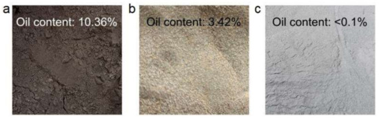 The separation of oily sludges was carried out with the cyclone equipped with a worm shell situated in front of the inlet port of the cyclone, which was capable of generating vortex flow using rotating blades to supply the inlet flow of cyclone. For comparison, the separation of oily sludges was also carried out using the cyclone without collection via worm shell. As shown in Figure 11a, the original oily sludges are dark brown, and the oil content is as high as 10.36%. After the separation by the cyclone without the collection of a worm shell, the already-separated oily sludges (denoted as cyclone-separated oily sludges) show an evidently lighter color, while still providing a high oil content of 3.42%. Notably, the cyclone equipped with a worm shell that generates vortex flow at the inlet successfully reduced the oil content in the separated oily sludges (denoted as optimized cyclone-separated oily sludges) to lower than 0.1% (0.02%), and the separated oily sludges show even lighter color than the cyclone separated-oily sludges. Therefore, these separation results strongly indicate that tuning the inlet flow pattern from linear flow to vortex flow significantly accelerates the rotation speed of oily sludge particles and high-speed rotation areas, which therefore enables the significant improvement of separation efficiency of oily pollutants from the oily sludges.