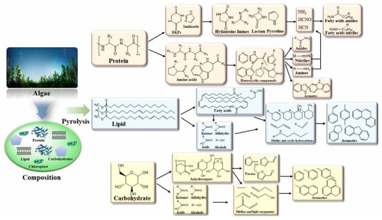 Pyrolysis of algae biomass is an uneven decomposition process for its primary components, i.e., lipids, proteins and carbohydrates. Operating parameters, including temperature, heating rate and residence time, greatly affect the degree of decomposition of biomass components [31]. The diverse and complex product distribution in algae biomass pyrolysis indicate an intricate pathway for decomposition (Figure 3). In general, carbohydrates are the first components decomposed below 300 °C, followed by proteins and lipids [90]. Monosaccharides and polysaccharides encompassing glucose, pectin, agar, mannose, alginate, laminarin, fucoidan, etc.,. are the main carbohydrates synthesized in diverse algae species [55]. Carbohydrates are first pyrolyzed to anhydro-sugars and furfurals and then produce oxygenated compounds, such as alcohols, ketones, aldehydes and acids, by a series of reactions [91]. Some of the intermediate pyrolytic products can subsequently undergo cyclization to form aromatic hydrocarbons [92]. Proteins are biological macromolecules assembled from polypeptide chains, and are dehydration and condensation products of amino acids [91]. Pyrolysis of proteins in algae generally refers to the irregular cleavage of the main chain, cleavage of lateral groups, and carbonation reactions [93]. The irregular breaks in the main chains form different fragments in length, as well as N-containing heterocycles. Lateral groups are not stable in pyrolytic conditions and tend to break into small molecule compounds. The other main chains can form polyolefins or benzene derivatives [94]. Cross-linking, cyclization, and dehydro-aromatization reactions of the reactive side chains generate N-doped char [91]. Lipids are small molecules produced from esterification of fatty acids and alcohols. The pyrolysis of lipids starts from decomposition into fatty acids and further reactions, such as cracking, decarbonylation, and aromatization. Isomerization of the intermediates generates aldehydes, ketones, alcohols and acids. Finally, hydrocarbons, CO, and H2O are formed through cracking, β-scission and elimination reactions [5,95].