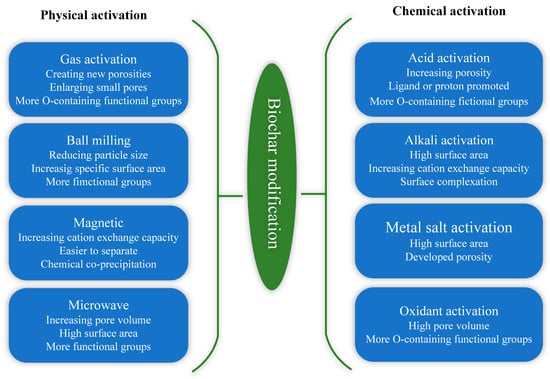 The modification of biochar mainly includes physical activation and chemical modification. Effects of different modification methods on the properties of biochar are shown in Figure 4.