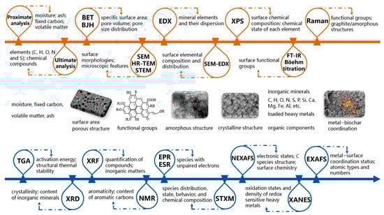 An adequate decipherment of structural characteristics and physicochemical properties is beneficial in evaluating the preparation, modification and potential application of biochar. Biochar characterization is necessary for the conversion process and has become a more professional research field of increasing interest [122]. To obtain a precise and holistic characterization, multiple analysis techniques are used in combination [123]. The most commonly adopted techniques are summarized in Figure 5. These techniques reveal the features of biochar which are commonly defined as physical and chemical properties. The physical properties of biochar primarily involve surface and pore structure, like specific surface area (SSA), porosity, pore volume and pore size distribution, etc. Furthermore, biochar yield, electrical conductivity, higher heating value, hydrophobicity and water holding capacity are also defined as physical properties in many cases [29]. Chemical properties of biochar include ultimate analysis (elemental composition), proximate analysis (fixed carbon content, volatile matter content, ash content), cation exchange capacity (CEC), pH-value and surface functional groups [1]. Both types of property are related to feedstock, preparation condition and modification method, and can influence the effect and the application field of biochar.