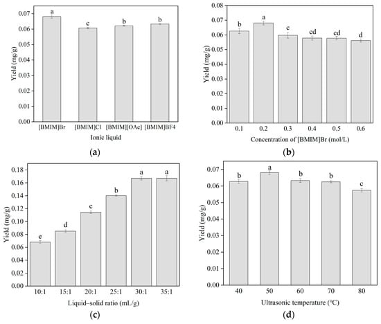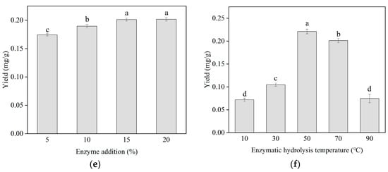 The effect of different parameters on the extraction yield of quercetin from dandelion: (a) ionic liquid; (b) the concentration of [BMIM]Br; (c) liquid–solid ratio; (d) ultrasonic temperature; (e) enzyme addition; (f) enzymatic hydrolysis temperature. The data are shown as mean ± SD (n = 3). Different letters have significant differences in the mean at the 0.05 level.