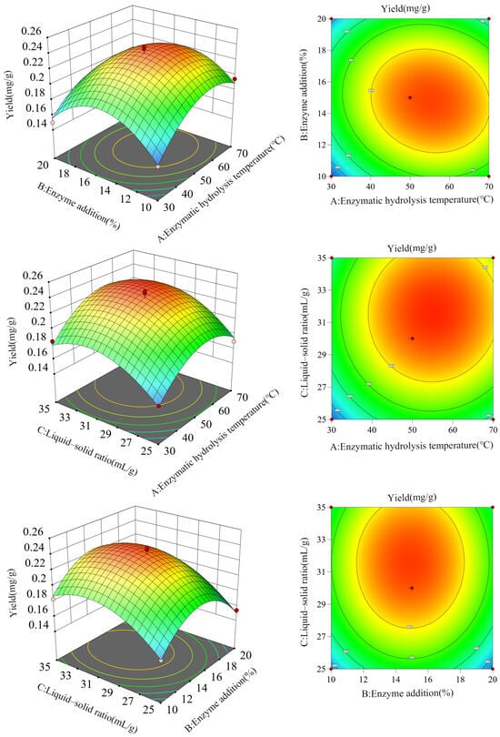 The three-factor, three-level central combination experimental design featured enzymatic hydrolysis temperature (A), enzyme addition (B), and liquid–solid ratio (C) as independent variables, and the response surface optimization experimental design and results are shown in Table 3. The results show that there is a second-order polynomial relationship between these three independent variables: