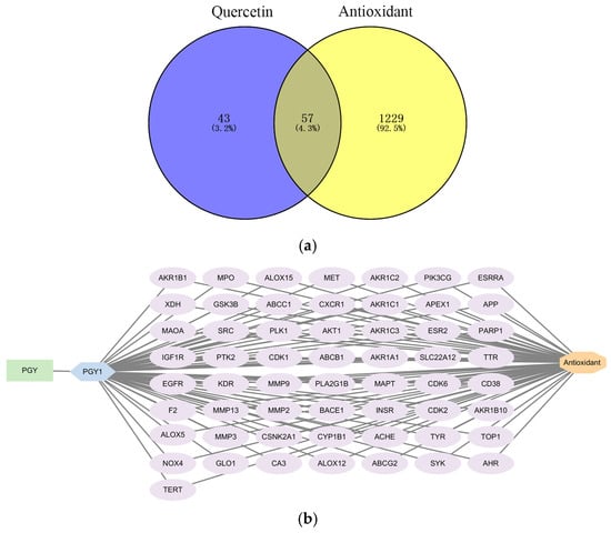 Network pharmacology analysis of quercetin–antioxidant relationship: (a) Venn diagram of quercetin–antioxidant targets; (b) quercetin–antioxidant target network. Green rectangular nodes represent dandelions; blue hexagonal nodes represent quercetin; orange octagonal nodes represent antioxidant functions; and purple oval nodes represent intersecting targets.