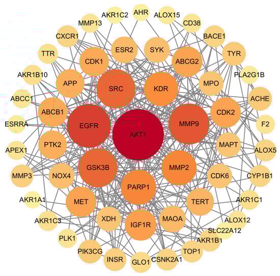 The existence of 100 potential targets of quercetin in dandelion was predicted by SwissTargetPrediction, and 4901 antioxidant-related targets were retrieved from related databases, and 1286 antioxidant-related targets were obtained by filtering with a relevance score ≥0.88 as the criterion. The intersection of quercetin potential targets and antioxidant-related targets was taken to draw a Venn diagram, and 57 intersecting targets were obtained, as shown in Figure 3a. The quercetin–target–function network diagram in dandelion was drawn using Cytoscape 3.10.1, as shown in Figure 3b.