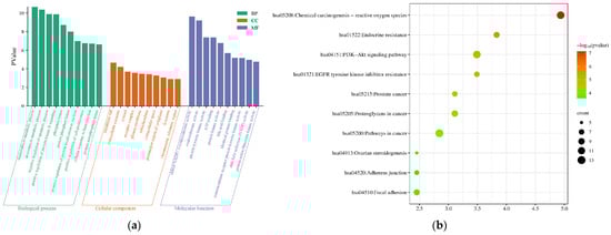 The 57 intersecting targets were imported into the DAVID database, yielding 333 GO entries and 76 KEGG pathways. The biological processes involved in the quercetin antioxidant targets include the daunorubicin metabolic process, doxorubicin metabolic process, negative regulation of the apoptotic process, positive regulation of protein kinase B signaling, protein phosphorylation, and the positive regulation of protein localization to the nucleus. Cellular components include the membrane raft, extracellular exosome, cytosol, receptor complex, plasma membrane, and mitochondrion. Molecular processes include alditol: NADP+1-oxidoreductase activity, oxidoreductase activity, protein tyrosine kinase activity, ATP binding, and protein kinase activity, as shown in Figure 5a. Following the analysis of KEGG pathways, it can be seen that the main antioxidant pathways of quercetin are chemical carcinogenesis-reactive oxygen species, endocrine resistance, EGFR tyrosine kinase inhibitor resistance, the PI3K/Akt signaling pathway, prostate cancer, proteoglycans in cancer, pathways in cancer, focal adhesion, the adherens junction, and ovarian steroidogenesis, as shown in Figure 5b.