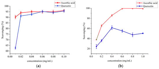 The antioxidant ability of the quercetin: (a) DPPH radical scavenging activity; (b) •OH radical scavenging activity. Data are shown as the mean ± SD (n = 3).