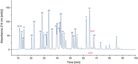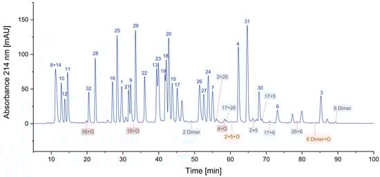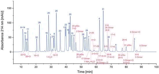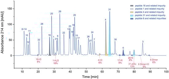 Considering the number of impurities of a specific class (Figure S2, Supplementary Materials), hetero- and homodimers of cysteine-containing peptides (23) are by far the most frequent. Also present are peptides with methionine sulfoxide (6) and N-terminal pyroglutamates (4). Deletion peptides (2), aspartimides (1), and deamidation products (1) are quite rare. Nevertheless, the number of impurities may be not the most relevant parameter. Assuming that the parent peptide is the only active one and the byproduct is inactive, the residual percentage of the parent peptide would be interesting. Hence, we calculated these percentages based on the UV area for some peptides. In Figure 7, the areas of various peptides and their corresponding impurities are presented in the chromatogram. The pairs of parent peptides and their corresponding impurities are shown in the same color.