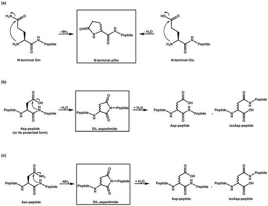 Cyclization of amino acid residues and subsequent reactions: Reaction pathways for the formation of (a) pyroglutamate, and (b) aspartimide, as well as for (c) deamidation.