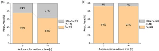 The formation of pyroglutamate usually occurs via acid catalysis [17]. Consequently, it can take place during solid-phase peptide synthesis (SPPS) when coupling an amino acid to the N-terminal glutamine or glutamic acid of the peptide, as well as during the final deprotection and cleavage of the completed peptide. Furthermore, this side reaction has been observed outside of peptide synthesis in acidic aqueous solutions at room temperature [18]. Beck et al. demonstrated that pyroglutamate formation can occur even in a freeze-dried state at elevated temperatures (37 °C), leading them to conclude that similar effects may be expected during long-term storage at lower temperatures [2]. Additionally, under neutral and basic conditions, the formation of pyroglutamate was observed in combination with elevated temperatures in N-terminal glutaminyl peptides [19,20]. The conversion of a peptide into a pyroglutamyl peptide can significantly influence its properties. For example, aminopeptidases are usually not able to cleave this terminal amino acid and the positive charge of the N-terminus is lost. Additionally, it has been shown that the cytotoxic T lymphocyte (CTL) activity of pyroglutamyl peptides may decrease compared to that of unmodified peptides [2]. In the current study, where a glutamic acid or a glutamine was expected at the N-terminus, the formation of some pyroglutamate peptide was detected in all cases. In a solvent consisting of water with 5% acetonitrile and 0.05% trifluoroacetic acid, terminal glutamic acid was fairly stable for several days, in contrast to glutamine, which significantly degraded into pyroglutamate during 16 days of storage (Figure 3). Complete datasets are presented in Figure S1 of the Supplementary Materials. A similar behavior was also reported in the literature before [21]. A comparison of the relative proportions of the pyroglutamate species (pGlu-Pep23: 24%; pGlu-Pep20: 7%) with the purity of the individual peptides, as indicated by the manufacturer (Peptide 23: 90.9%; Peptide 20: 95.1%), suggests that, in addition to the pyroglutamate present from the initial stages of synthesis and purification, storage and/or sample preparation are likely contributing factors to the observed pyroglutamate content.