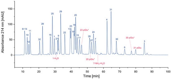 In Figure 4, all cyclized peptides, including those formed through a cyclic intermediate (deamidation), are indicated in red. Most of them are pyroglutamate-terminated peptides, only one is an aspartimide by-product, while another results from the deamidation of asparagine. They are separately listed in Table 2.