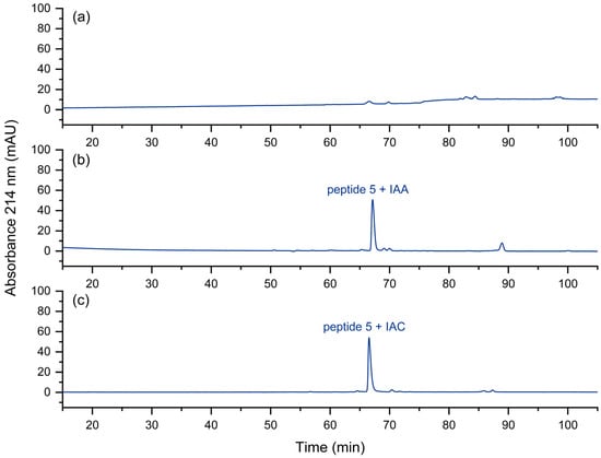 UV chromatogram of (a) the cysteine-containing peptide 5, (b) iodoacetamide-alkylated peptide 5, (c) iodoacetic acid-alkylated peptide 5. No peak is obtained for peptide 5 with a free, N-terminal thiol group. Relative to the total peak areas (214 nm) of each chromatogram, with IAA a purity of 73% was obtained, in contrast to 84% with IAC.