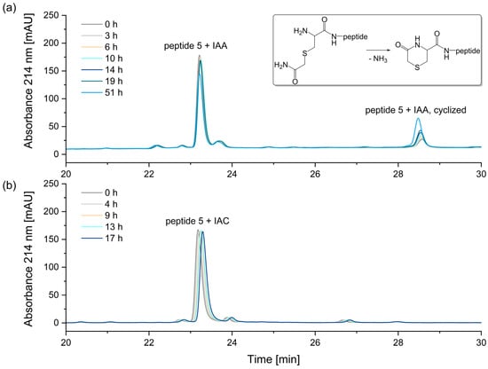 Stability of alkylated peptide 5 containing an N-terminal cysteine. (a) Peptide 5 + iodoacetamide (IAA), (b) Peptide 5 + iodoacetic acid (IAC). The N-terminal cysteine of peptide 5 alkylated with iodoacetamide reacts to form N-terminal 5-oxohydro-1,4-thiazine-3-carboxylic acid, as indicated by a mass difference of −17 Da. After 51 h, the relative peak area of the peptide alkylated with iodoacetamide decreased by 18%. In contrast, no significant degradation was observed for peptide 5 alkylated with iodoacetic acid.