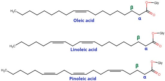 Common fatty acids found in pine almonds include linoleic and oleic acids, which are unsaturated fatty acids, and palmitic, stearic, and lignoceric acids, which are saturated fatty acids [30,49]. Figure 2 shows the chemical structure of three unsaturated fatty acids commonly found in pine nuts and P. cembroides kernels.