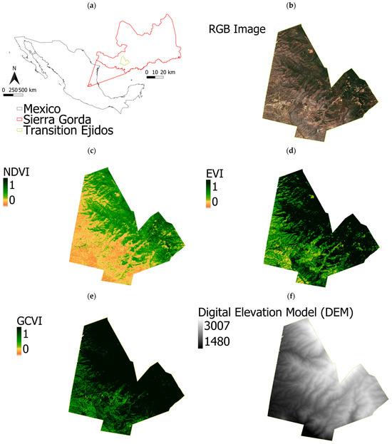 As examples of other omics approaches, Montes et al. conducted a genomic study on the phylogenetics of P. cembroides using low-copy nuclear gene sequences, offering critical insights into the relationships between P. cembroides varieties and their chemical compositions [9]. Additionally, phenomics studies focus on regional and ecological dimensions, leveraging remote sensing data from passive sensors such as Unmanageable Aerial Vehicles (UAV), satellites, such as Landsat and Sentinel and active sensors such as Light Detection and Ranging (LiDAR) [95,96]. Spectral and multispectral pixel data from images can capture phenotypes related to plants’ biochemical and physiological traits, stress levels, phenology, and overall health [97,98,99,100]. Typical RGB bands and spectral indices like the Normalized Difference Vegetation Index (NDVI), Green Chlorophyll Vegetation Index (GCVI), and Enhanced Vegetation Index (EVI) are used to analyse these characteristics [98]. These methods can also be applied as time-series analyses to track changes. In P. cembroides, such approaches have linked forest pest infestations with NDVI values [101] and mapped varieties like P. monophyla [102]. Figure 3 depicts vegetation and physiographic patterns in the Sierra Gorda Biosphere Reserve, Mexico, where these species are found. This transitional region includes four “Ejidos”: Camargo and Maguey Verde in the Peñamiller municipality, as well as El Tejamanil and Madroño in Pinal de Amoles.