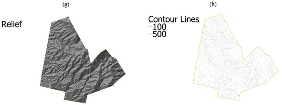 This figure presents various traits analyzed using physiographic features and vegetation indices. (a) Location of the piñon zone within the Sierra Gorda Biosphere Reserve; (b) RGB image showing visual colour representation; (c) Normalized Difference Vegetation Index (NDVI) image; (d) Enhanced Vegetation Index (EVI) image. (e) Green Chlorophyll Vegetation Index (GCVI) image (f) Digital Elevation Model (DEM) of the area (g) Relief map of the zone; (h) Contour lines of the region; The distinct patterns observed in these images result from the reflectance characteristics of the analyzed spectral bands. The images were generated using QGIS 3.36.3 and Google Earth Engine, utilizing harmonized Sentinel-2 imagery.