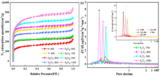 When the doping ratio of corn protein powder was held constant at S3Y6, both the specific surface area and pore volume showed a marked increase as the activation temperature rose from 700 °C to 1000 °C, with the specific surface area increasing from 878 m2/g to 1575 m2/g, and the pore volume rising from 0.39 cm3/g to 0.80 cm3/g. The higher activation temperature enhanced the reaction between K2CO3 and the carbon matrix, promoting the formation of additional pore channels, which further improved both microporous and mesoporous structures and increased the specific surface area and pore volume. However, it is noteworthy that when the activation temperature increased from 900 °C to 1000 °C, the proportion of micropores decreased from 90% to 81%, even though the total pore volume and microporous volume still showed an increasing trend. This phenomenon can be attributed to the increase in mesopores caused by excessively high temperatures, which allowed for a more complete reaction between K2CO3 and the carbon matrix. As a result, some of the micropores were transformed into mesopores or macropores. In addition, Figure 1b illustrates that micropores smaller than 1 nm in all samples were mainly concentrated in the 0.5–0.7 nm range. As the doping ratio of corn protein powder increased, the volume of micropores in the 0.5–0.7 nm range expanded significantly. When the doping ratio was fixed at S3Y6 and the temperature was increased from 700 °C to 800 °C, the volume of micropores in the 0.5–0.7 nm range also increased obviously. However, when the temperature was further raised to 900 °C or 1000 °C, the volume of ultramicropores in the range of 0.5–0.7 nm remained unchanged or slightly decreased, while the increase in microporous volume was more concentrated in the 0.7–2 nm range. According to a related study [24], micropores within V < 0.8 nm were particularly favorable for the adsorption of CH₄ molecules and had a significant effect on the selective adsorption of CH4/N2.