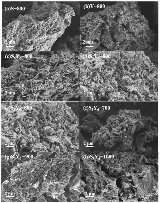 To further analyze the surface morphology of the samples, all samples were examined using scanning electron microscopy (SEM). As shown in Figure 2a, the surface of the K2CO3-activated S−800 samples exhibited an aggregated, rough granular morphology. This phenomenon can be attributed to the strong etching interaction between K2CO3 and the pine shavings at a high activation temperature of 800 °C. Figure 2b presents the surface morphology of the Y−800 sample, which displays a distinct spongy structure with a looser, more porous surface and a denser pore distribution. These observations are consistent with the results from the N2 adsorption–desorption experiments. Figure 2c illustrates the surface morphology of the S6Y3−800 sample. In comparison to S3Y6−800, the pore structure of S6Y3−800 was significantly reduced, with an increase in rod-like structures and a decrease in sponge-like structures. This suggests that variations in the doping ratio of corn protein powder have a marked impact on the surface morphology of the porous carbon, which in turn influences its pore structure and overall properties. The surface morphology of the samples shows a certain regularity as the temperature changes. When the activation temperature was 700 °C (Figure 2f), the surface of the S3Y6−700 sample exhibited large, irregular massive particles. This can be attributed to the weak K2CO3 activation at lower temperatures, which fails to fully react with the carbon matrix, resulting in incomplete formation of pore structures. However, when the temperature was increased to 800 °C, the surface of the S3Y6−800 sample displayed a dense spongy structure, accompanied by a significant increase in the pore structure. It is worth noting that the appearance of some of the rod-like structures is related to the generation of carbon nanotubes, which not only enhance the mechanical support of the carbon material and reduce the structural loss caused by the pore overlap, but also construct a three-dimensional (3D) network, which improves the gas molecule transport efficiency, and consequently the adsorption performance [25]. When the activation temperature was further raised to 900 °C, the surface characteristics of the S3Y6−900 sample changed significantly. The spongy structure originally present almost disappeared and was replaced by aggregated spherical particles, while more carbon nanotube generation was observed. This phenomenon can be attributed to the fact that a large number of volatile components were released under high-temperature conditions at 900 °C, leading to a shift in the surface morphology of the material. Previous studies have shown that K ions play a very important role in this process. Specifically, K ions not only promoted the release of carbon-containing gases and aromatic compounds during biomass pyrolysis, but also accelerated the polymerization reaction of these gases, which ultimately promoted the formation of carbon nanotubes [26,27]. Therefore, K2CO3 plays a dual role in the activation process of carbon: on the one hand, it acts as an activator to promote the generation of pore structures by undergoing an etching reaction with the carbon matrix; on the other hand, it acts as a catalyst to promote the growth of carbon nanotubes by catalyzing the release of carbon sources. This dual function makes K2CO3 play an important role in regulating the microstructure of carbon materials, which affects their adsorption properties and other physicochemical properties. The transformation of micropores into mesopores and macropores as the temperature increases to 1000 °C suggests that excessively high activation temperatures promote the thorough reaction of K2CO3 with the carbon substrate, causing some micropores to merge into mesopores and macropores. Given the excellent pore structure observed in the S3Y6−800 sample, subsequent studies will focus on examining the effects of temperature on the properties of porous carbon at this specific doping ratio.