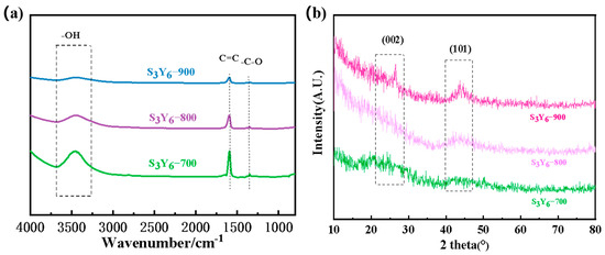 (a) XRD diagrams of samples S3Y6−700, S3Y6−800, and S3Y6−900; (b) FT-IR of samples S3Y6−700, S3Y6−800, and S3Y6−900.