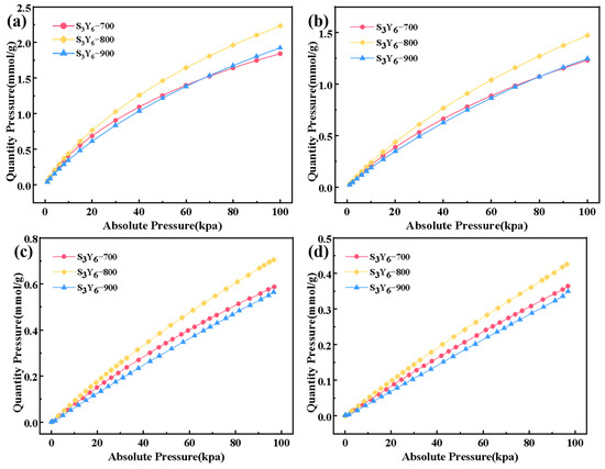To investigate the adsorption properties of N-doped porous carbon prepared at different activation temperatures for CH4 and N2, adsorption isotherms were measured at 273 K and 298 K. The results are presented in Figure 6 with detailed data in Table 6. The findings reveal that CH4 adsorption is significantly higher at 273 K compared to 298 K, indicating that CH4 adsorption is an exothermic physisorption process [38]. Furthermore, the adsorption capacity for CH4 was generally greater than for N2 at specific temperatures, primarily due to the higher polarizability of CH4 compared to N2. The increased polarizability of CH4 enhances its interaction with the adsorbent surface, allowing more gas molecules to be adsorbed into the micropores. In contrast, N2’s lower polarizability weakens its interaction with the adsorbent, resulting in lower adsorption capacity [39]. Notably, S3Y6−800 exhibits the best CH4 adsorption performance, despite having a smaller specific surface area and pore volume than S3Y6−900. At 273 K and 1 bar, the CH4 adsorption of S3Y6−800 reached 2.23 mmol/g, compared to 1.47 mmol/g at 298 K and 1 bar. According to the literature, when the specific surface area of activated carbon exceeds 1000 m2/g, the surface area is no longer the sole determinant of adsorption capacity, as the microporous structure and surface functional groups also play a crucial role in enhancing CH4 adsorption. The nitrogen-doped porous carbon prepared here exhibits excellent CH4 adsorption properties at low temperatures and high pressures, making it valuable for natural gas storage and transport.