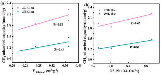 To further explore the relationship between pore structure, surface properties, and CH4 adsorption capacity, the microporous volume (V < 0.6 nm), along with specific N and O functional groups, were linearly correlated with the CH4 adsorption capacity. The results of the fitting are shown in Figure 7. The data in the figure show that the correlation between microporous volume of V < 0.6 nm and CH4 adsorption was low (R2 = 0.43) at 298 K and 1 bar. In contrast, the specific N and O functional groups (N5 + N6 + O3 + O4) exhibited a much stronger linear relationship with CH4 adsorption capacity, with R2 values of 0.58 at 298 K and 0.86 at 1 bar. These results suggest that the N5 + N6 + O3 + O4 functional groups have a significant effect, while the microporous volume of V < 0.6 nm contributed relatively little to the adsorption capacity. This is due to the fact that the introduction of nitrogen-containing functional groups (e.g., N-5 and N-6) can significantly increase the surface alkalinity and polarity of the carbon materials, thereby enhancing their electrostatic interactions with CH4 molecules. Specifically, the N-5 and N-6 functional groups not only promote the surface polarization and dipole interactions of CH4 molecules, but also increase the reactivity of the material surface to trap and immobilize gas molecules, further enhancing the adsorption efficiency [6]. On the other hand, C-O and COOH functional groups likewise positively affect the CH4 adsorption capacity. For the pore volume aspect, the narrow microporous structure with V < 0.6 nm provides more accommodating space and the potential overlap between the pore walls enhances the interactions between the pore structures, both of which are favorable for CH4 capture [40].