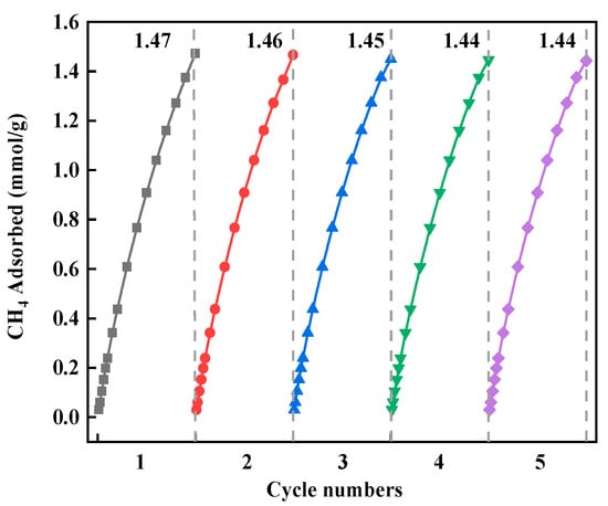 In order to evaluate the regeneration performance of S3Y6−800 in practical applications, five CH4 adsorption–desorption cycling experiments were carried out at 298 K and 1 bar. The experimental results are shown in Figure 9. After five cycles, the adsorption performance of the sample only decreased by 2.04%, indicating its excellent regeneration capability.