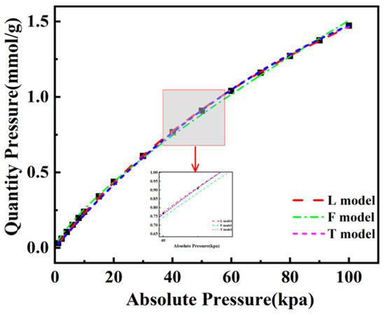 To further investigate the adsorption behavior of S3Y6−800 towards CH4 molecules, its adsorption isotherm at 298 K was fitted using the Langmuir, Freundlich, and Toth models. The results are shown in Figure 11, with the fitting parameters listed in Table 7. All three models demonstrated excellent fitting results, with R2 values greater than 0.99, indicating a high degree of consistency in the fitted data. Specifically, S3Y6−800 exhibits an RL < 1, indicating that the material has good CH4 adsorption properties. In the Freundlich model, the isotherm constant (KF) represents the adsorption capacity, while the n value reflects adsorption strength. The n value of 1.299 (>1) suggests that the adsorption process is primarily physical, and the inhomogeneity factor (1/n) of 0.77 further indicates surface inhomogeneity, due to the uneven distribution of micropores or surface functional groups. The Toth model provided the most accurate fit for the adsorption isotherm. The Toth model’s inhomogeneous factor (nT) of 1.1981 indicates nonhomogeneous adsorption on sub-monolayer, where the surface is not entirely homogeneous. When nT = 1, the adsorbent surface is considered homogeneous. The R2 value of the Toth model (0.9999) demonstrates an extremely high fitting accuracy, suggesting that it provides the most precise description of the adsorption process. According to the R2 evaluation, the adsorption isotherm fitting followed this order: Toth model (R2 = 0.9999) > Langmuir model (R2 = 0.9998) > Freundlich model (R2 = 0.9985). In conclusion, the Toth model more accurately describes the CH4 adsorption isotherm of S3Y6−800 at 298 K, with the adsorption process consistent with the microporous-filled sub-monolayer coverage mechanism.