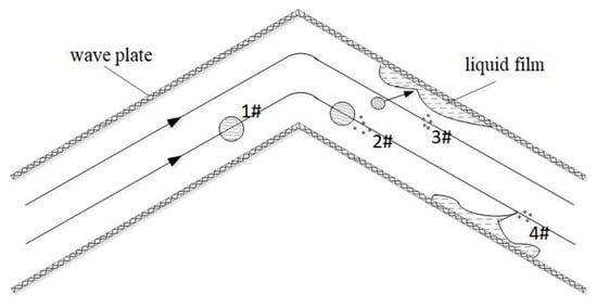 During the movement of the droplets in the channel of the demister wave plate, the interaction among the gas flow, the slurry droplets, and the adherent liquid film is extremely complicated [9,10]. The droplet movement in the wave plate is shown in Figure 1. Numerous studies have shown that the two main reasons for the droplets are the splash caused by the impact of the droplet on the liquid film (Phenomenon 3) [11] and the rupture of the liquid film caused by the shearing of the gas stream (Phenomenon 4) [12]. The collision of liquid droplets with the liquid film is the main cause of secondary liquid droplets. Therefore, the gas–liquid fluid flow behavior mechanism in desulfurization and the demister is one of the key basic research contents [13,14]. It is indispensable for establishing a gas–liquid flow characteristic model in the demister considering the re-entrainment.
