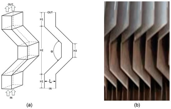 Baffle demister plate configuration: (a) Schematic diagram; (b) Engineering appearance. The flow field of the demister is originally three-dimensional, but the regular structure can simplify it to two-dimensional flow. Entrances and exits are denoted by IN and OUT, respectively. The baffle plates are relatively parallel, and the spacing of the plates is L. The entry and exit segments are both H1 in length and H2 in distance from each other. The length of the middle segment is H3. The entrance section and the exit section are, respectively, connected with the middle section by a diagonal channel, and the angle between the two diagonal channels is α.