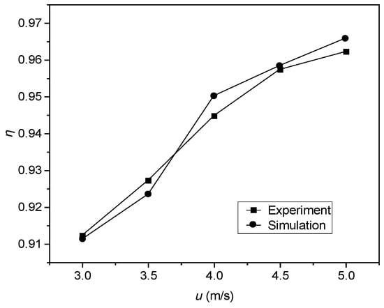 In order to verify the accuracy of the model and parameters used, this study conducts the simulation according to the structural and operating parameters in Ref. [32], with the angle set at 75° and the particle size at 50 μm. The comparison between the simulation results and the experimental data is shown in Figure 4. The good agreement between simulation and experiment indicates that the model and parameters used can be used to simulate the demister.