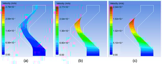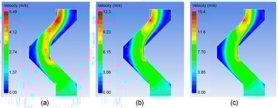 Velocity distribution in the demister channel with different inlet flow rates: (a) 2 m/s; (b) 4 m/s; (c) 5 m/s.