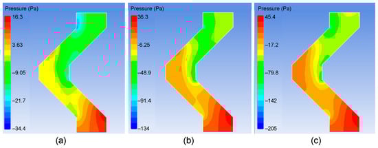 Pressure distribution in the demister channel with different inlet flow rates: (a) 2 m/s; (b) 4 m/s; (c) 5 m/s.