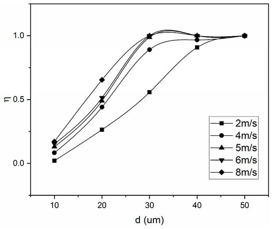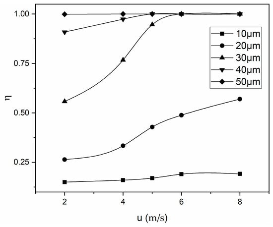 In addition, when comparing the trend graphs of different droplet sizes, it can be seen that the efficiency is relatively low with small droplet sizes. However, the efficiency increases with bigger droplets. For example, the efficiency is close to 100% at a low velocity when the droplet diameter is 50 μm. When the free flow against the wall is blocked, the inertial force is also greater, because that larger droplet has greater inertia.