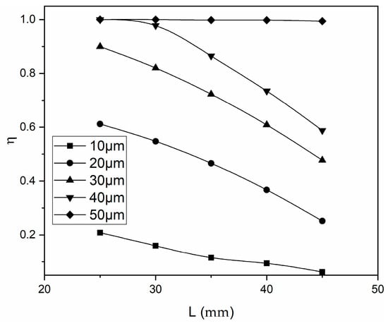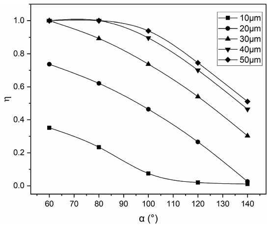 Figure 10 shows the relationship between plate turning angle and defogging efficiency in the case of plate spacing L = 30 mm, gas velocity u = 3 m/s, and droplet diameter D between 10 and 50 µm. It can be seen from Figure 10 that the defogging efficiency decreases as the plate turning angle increases. As the turning angle increases, the degree of bending of the demister channel decreases, and the angle change in the airflow direction decreases, which reduces the inertial force of the droplets. Therefore, more droplets follow the gas flow out of the channels, reducing the defogging efficiency. It can also be seen that the defogging efficiency with larger droplets decreases at a lower rate than the small-diameter droplets as the turning angle increases. The reason for this is that the centrifugal force is directly proportional to the diameter of the droplet. The inertia force of the small droplet is small, which makes the gas flow change direction more easily.