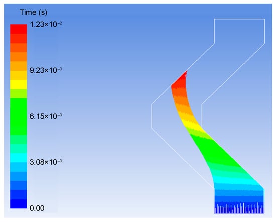As shown in Figure 13, under the given conditions of the turning angle α = 90° and the plate spacing L = 30 mm, the liquid film formed under the wallfilm condition when the gas velocity is 8 m/s. The general characteristic presented by the wallfilm wall condition is consistent with the trap wall condition. The coloration of the liquid film is distinguished by the height of the liquid film. It can be seen that the thickness of the liquid film is greater on the right wall surface of the first turning point compared to that on the left wall surface of the second turning point. Then, the direction of movement is changed, which is consistent with the gas current turning situation described by the droplet trajectory diagram shown in Figure 12.