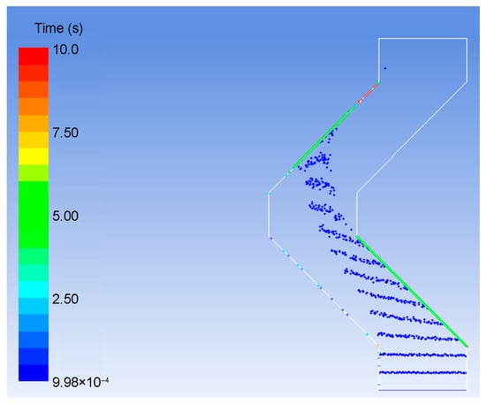 As shown in Figure 12, under the given conditions of the turning angle α = 90° and the plate spacing L = 30 mm, when the gas velocity is 8 m/s, the droplets’ movement trajectory of the trap wall condition is analyzed. It can be seen that the droplets are all captured by the wall at the second turning point, and the defogging efficiency is close to 100%.
