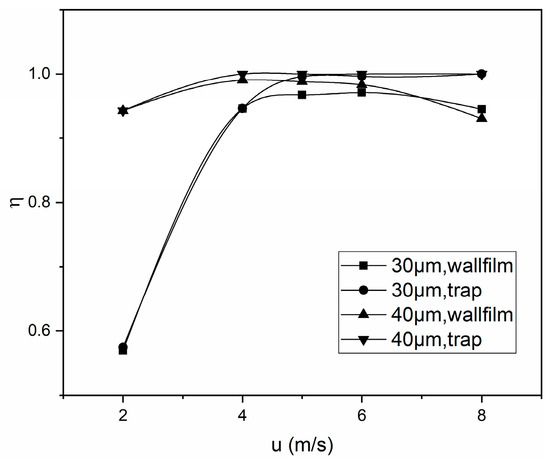 In addition, when in a high gas flow velocity, the efficiency of the trap model is close to 100%, which is inconsistent with the actual situation. However, the efficiency of the wallfilm model decreases when the flow velocity is high, which is consistent with the phenomenon that the droplets will interact with the wall surface at a higher velocity.