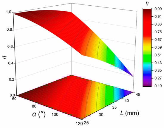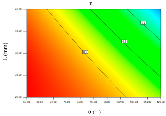 By performing a surface analysis on the above fitting results, a relationship diagram between the efficiency (η), the turning angle (α), and the plate spacing (L) can be obtained. A specific curved surface is shown in Figure 15, and an efficiency contour is shown in Figure 16. The droplet diameter (d) and the velocity (u) are set to 30 μm and 4 m/s, respectively. It can be seen that the defogging efficiency decreases as the turning angle increases and the plate spacing decreases. The characteristics can also be reflected in response surface analysis. When the turning angle and the plate spacing are the smallest, the efficiency is highest; moreover, when the turning angle and the plate spacing are the largest, the efficiency is the lowest. In addition, the response surface can show the influence of two factors on the efficiency of defogging.