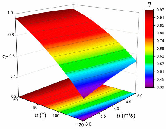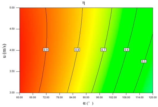 The relationship between efficiency (η), turning angle (α), and fluid velocity (u) can also be obtained. A specific curved surface is shown in Figure 17, and an efficiency contour is shown in Figure 18. The plate spacing (L) and droplet diameter (d) are set to 35 mm and 30 μm, respectively. The defogging efficiency decreases as the turning angle increases, and the gas flow velocity decreases. The characteristics can also be reflected in the response surface method, and the effect of the two couplings on efficiency is clear and intuitive. From the efficiency curves shown in Figure 15 and Figure 17, it can be seen that the turning angle has a greater effect on efficiency. When the turning angle is 60°, its influence on efficiency is dominant. When the plate spacing or gas velocity changes, the efficiency is always maintained at a high level.