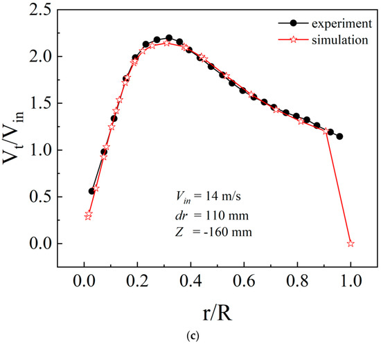 The simulation employed hexahedral meshes. To verify mesh independence, the structure with a cylinder diameter of D = 300 mm was selected, and four different mesh counts were used: 153,265, 182,731, 231,258, and 256,312. Figure 2a,b shows the tangential velocity and the meshing model, respectively. It is evident that once the mesh count reaches 231,258, the tangential velocity no longer varies with further increases in mesh count. While higher mesh counts lead to longer computation times and greater difficulty in convergence, a balance between computational efficiency and accuracy is necessary. Therefore, the final mesh count of 231,258 was chosen. To validate the simulation method, the tangential velocity within the cyclone separator measured experimentally by Hu et al. [30] was used as a reference. The simulated tangential velocity obtained using the method presented in this study under the same conditions was compared with the experimental data, as shown in Figure 2c. The results indicate that the simulation data are in good agreement with the experimental measurements, thereby demonstrating the reliability of the simulation approach.