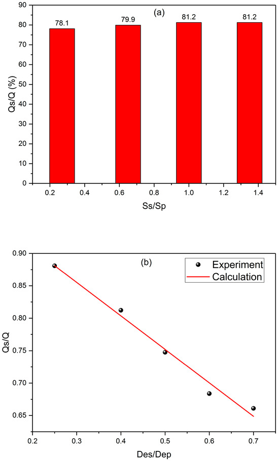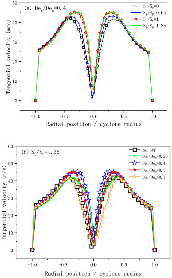 As shown in Figure 4b, it is also significant that the diameter of the SVF (Des) ranges from 0.4 to 0.5 that of the PVF (Dep), which is optimum because such a diameter yields the maximum improvement in the tangential velocity in the separation space of the primary cyclone. Decreasing or increasing the diameter of the SVF reduces the improvement in the tangential velocity. From the results, it is evident that when Des/Dep is increased to 0.7 or reduced to 0.25, the maximum tangential velocity almost equals that in the normal cyclone. Alternatively, a clear trend regarding the increasing tangential velocity with a decrease in the diameter of the vortex finder was observed inside a normal cyclone with only a single vortex finder. Although these differences are difficult to explain, we still find them plausible because they correspond to the results cited in other studies. Based on the analysis results, Des/Dep = 0.7 of the SFV results in 66% gas extraction through the PVF and a profile of tangential velocity extremely similar to that in a normal cyclone. Thus, enlarging Des/Dep further does not change the profile of the tangential velocity. Kępa [35] analyzed the tangential velocity profiles in cyclones with 20%, 40%, and 57% gas extraction through the PVF, corresponding to Des/Dep > 0.7, and found little difference among them, in agreement with the results of the present study. In addition, Kępa [35] found that none of these values were advantageous in terms of efficiency when compared with a normal cyclone. Based on the results of the present study, an overly high bleed flow provides one possible explanation.
