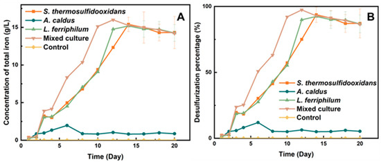 As shown in Figure 2A, the concentration of the total iron ions (both Fe3+ and Fe2+) in the system by the mixed culture reached the maximum value (15.98 g/L) on the 12th day (the percentage of desulfurization achieved over 90%). However, the pure culture of L. ferriphilum and S. thermosulfidooxidans took 14 days to achieve the same percent of desulfurization.
