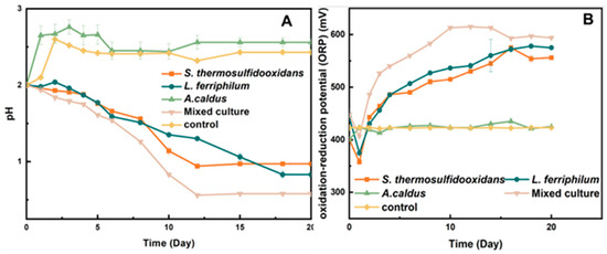 The bio-oxidation of pyrite was a process of sulfuric acid production. During the bio-desulfurization process, the pH values decreased on a large scale. It can be seen in Figure 3A that the pH value achieved the minimum value on the 16th day by the mixed culture, and it was consistently lower than that of the pure culture (Figure 3A). The pH values of S. thermosulfidooxidans and L. ferriphilum reached 0.93 and 0.83 on the 18th day, respectively. As shown in Figure 3B, the oxidation–reduction potential (ORP) of the mixed culture reached 615 mV on the 10th day, while the pure culture reached the maximum value (575 mV) at least 16 days. When the ions in the bioleaching system achieved balance, the ORP remained stable.