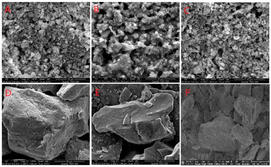 SEM Analysis of desulfurization of tin ore by pure culture and mixed culture. ((A): Mixed culture; (B): L. ferriphilum; (C): S. thermosulfidooxidans; (D): A. caldus; (E): abiotic control; (F): the original ore).