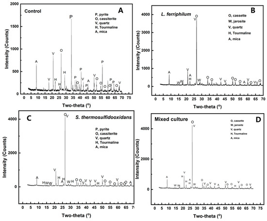XRD analysis of tin ore after bioleaching by control (A), L. ferriphilum (B), S. thermosulfidooxidans (C), and mixed culture (D).